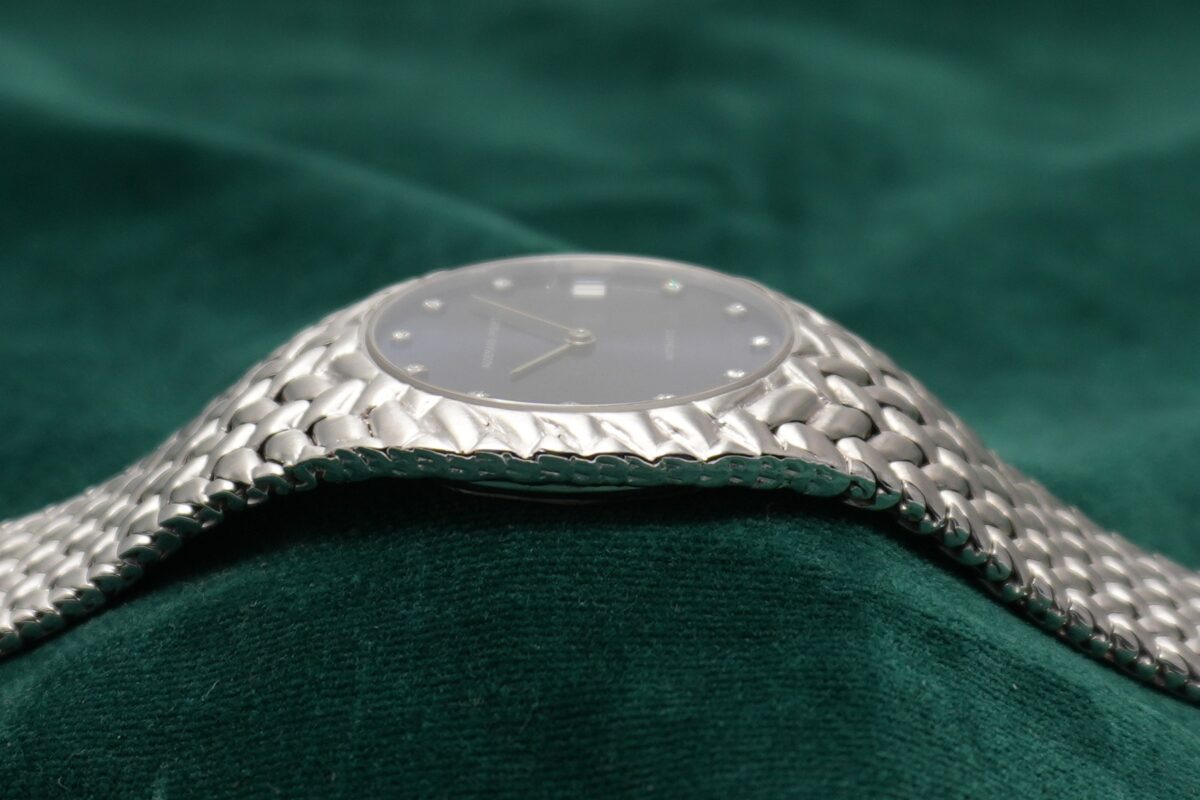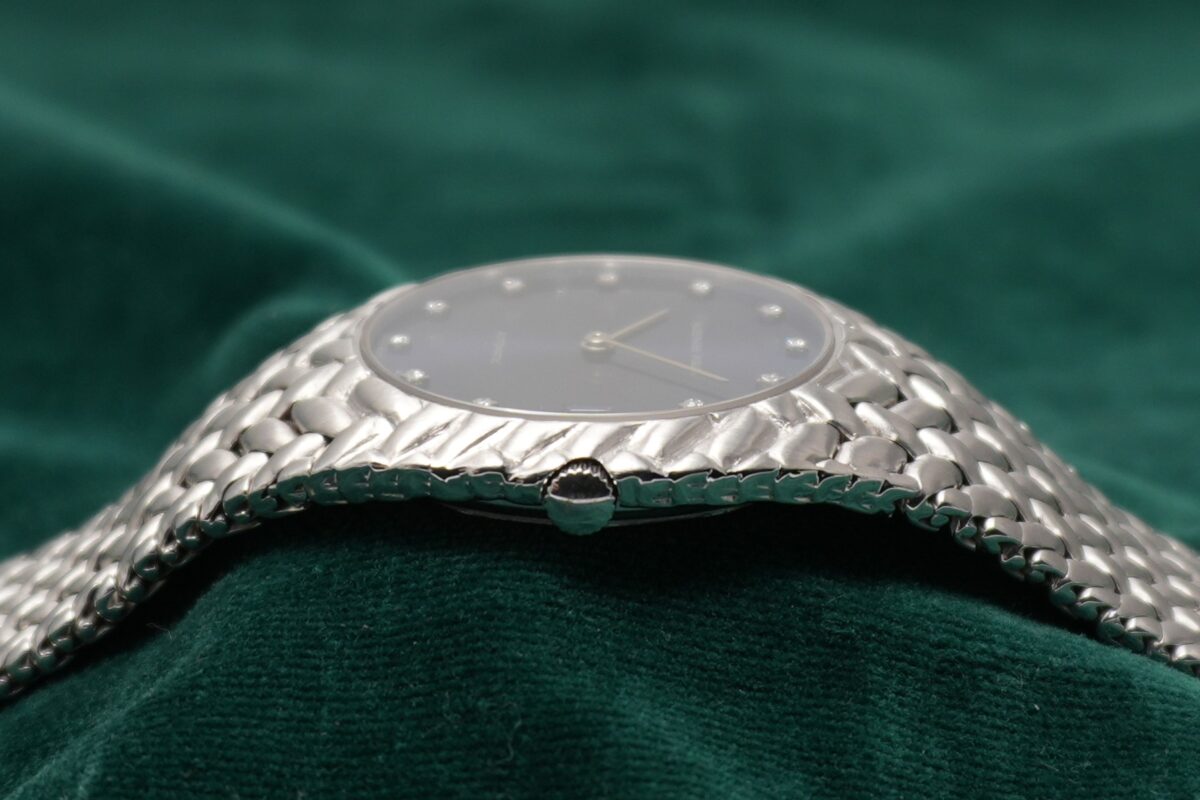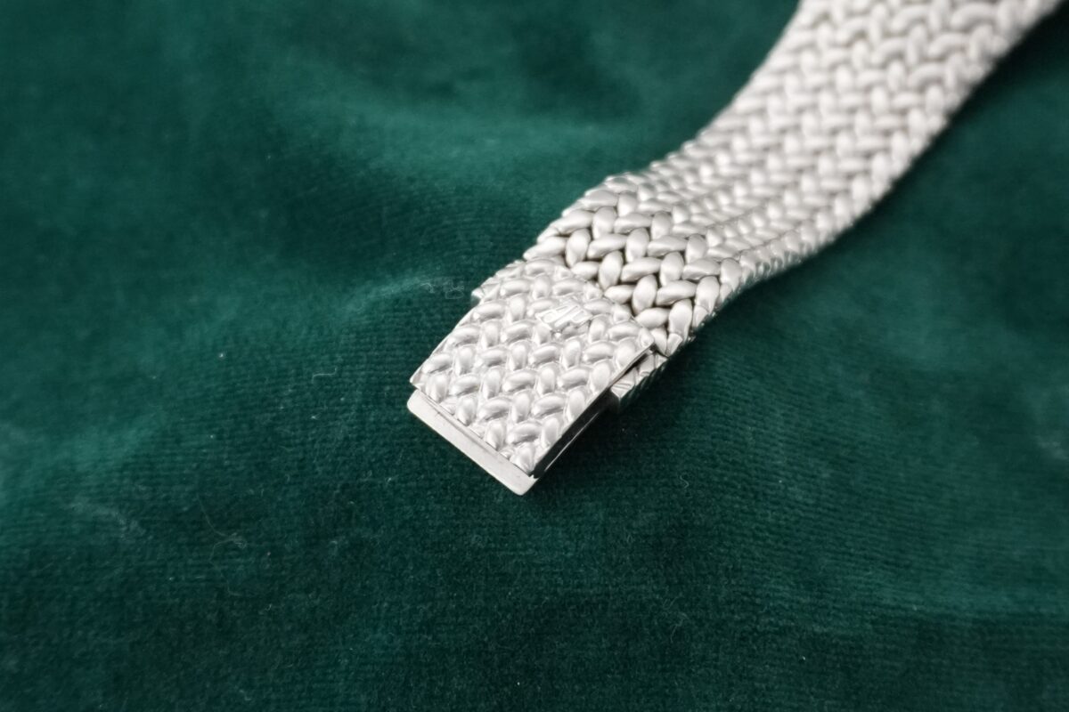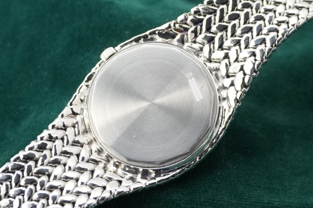 ケースは重厚感のある 18Kホワイトゴールド製。編み込まれたような独特のテクスチャーが存在感を放ち、薄型ながらスクリューバック仕様で、コンパクトに設計されたリューズと相まって全体のシンメトリーが美しく保たれています。
