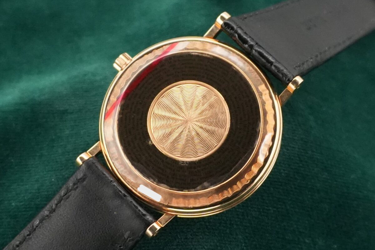 ケースは上品なローズゴールド仕様で、イエローゴールドやホワイトゴールドよりも数が少ない印象です。バックケースにはマリー・アントワネットをはじめとした48人の著名顧客の名前が刻まれており、ブレゲが歴史的に著名人に愛されたブランドであったことを物語っています。