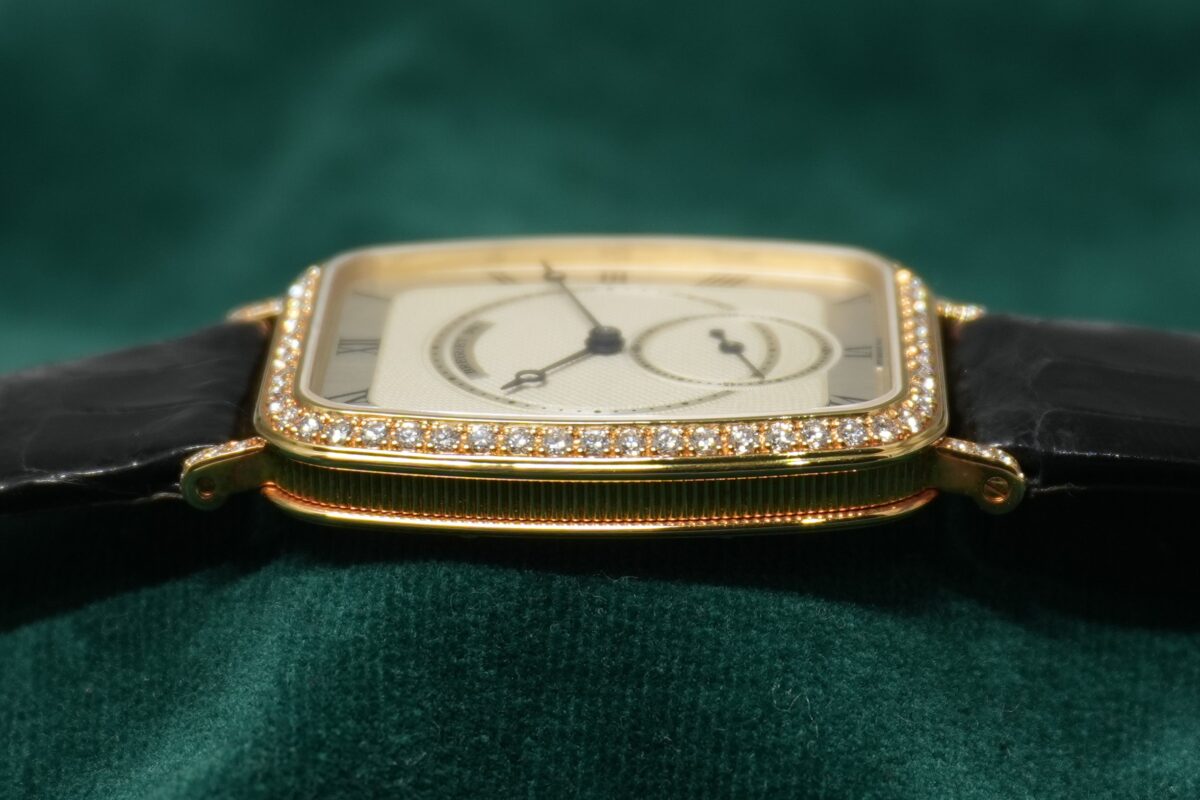 ラウンドケースは市場でも見かけますが、トノー型は流通量が少なく、さらにオリジナルのダイヤモンドセッティングを備えた個体は極めて希少です。クラシカルでありながら華やかさも兼ね備えた一本です。