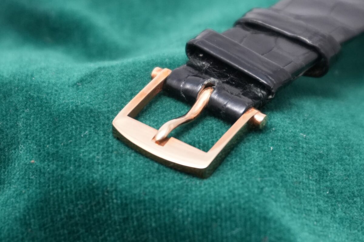 革ベルトは裏側に若干のダメージがあるものの、純正クロコダイル(ブラック)を装着し、純正18KYG尾錠が付属します。