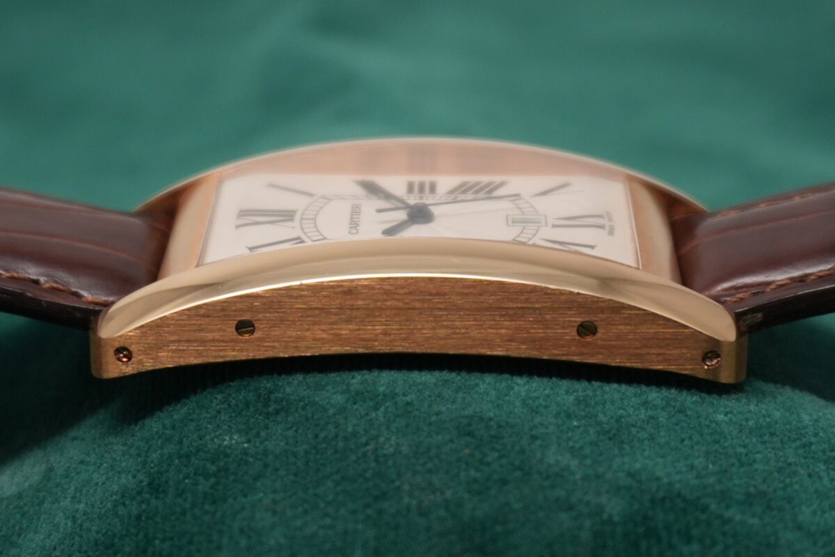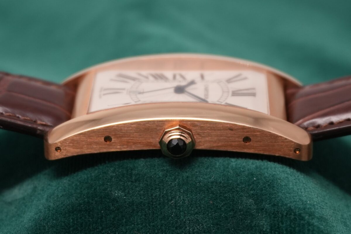 縦長のエレガントなケースフォルムを持つタンク アメリカンは、LMサイズならではの存在感がありながら、腕に沿う美しいカーブにより装着感は非常に快適です。