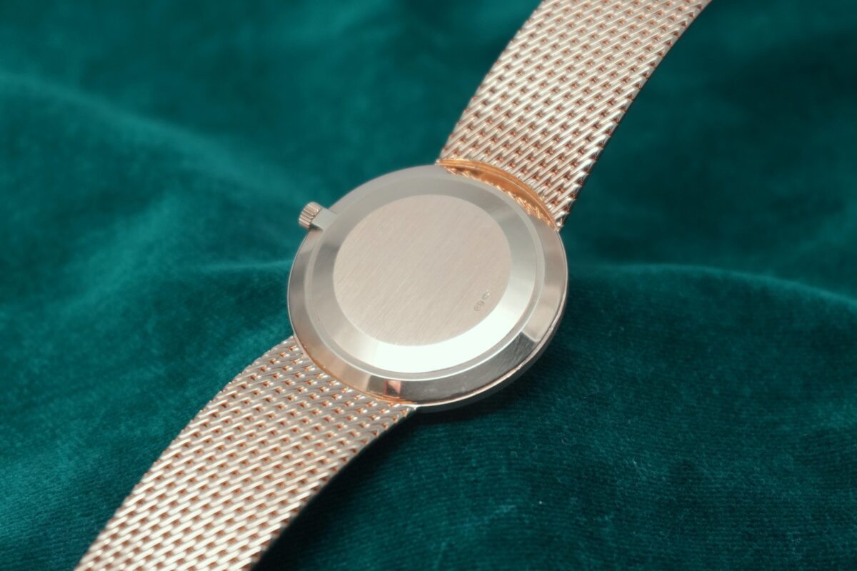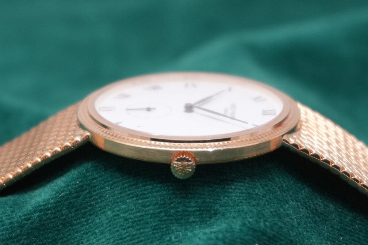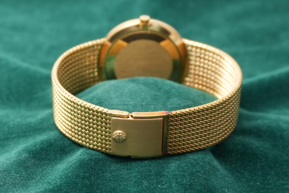18KYG のブレスレット一体型のケースにはクル・ド・パリのベゼルが付き、全体に若干の擦れや小傷はありますがダメージや磨きによって潰れがちな個体も多い中、エッジの立った抜群のコンディションです。