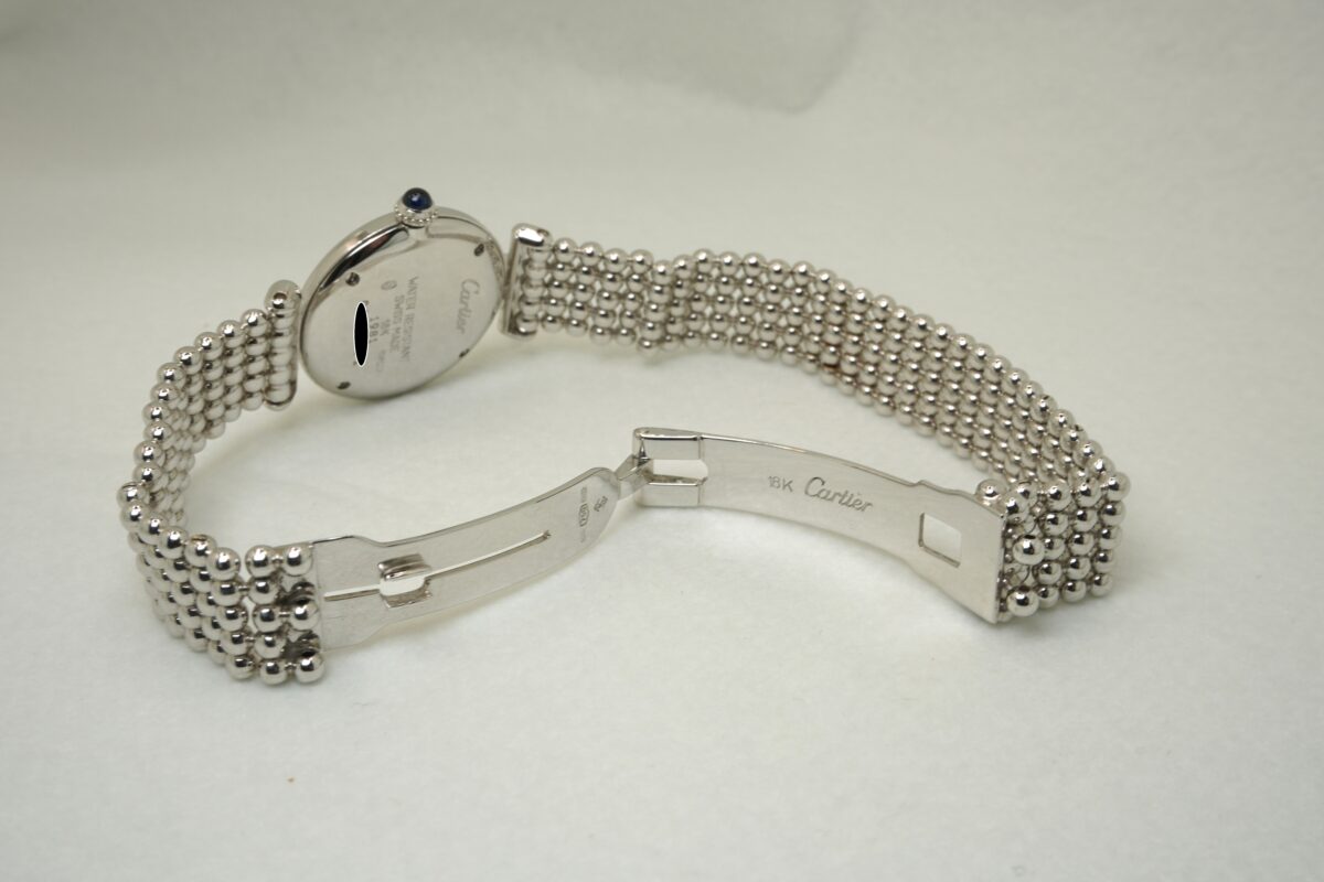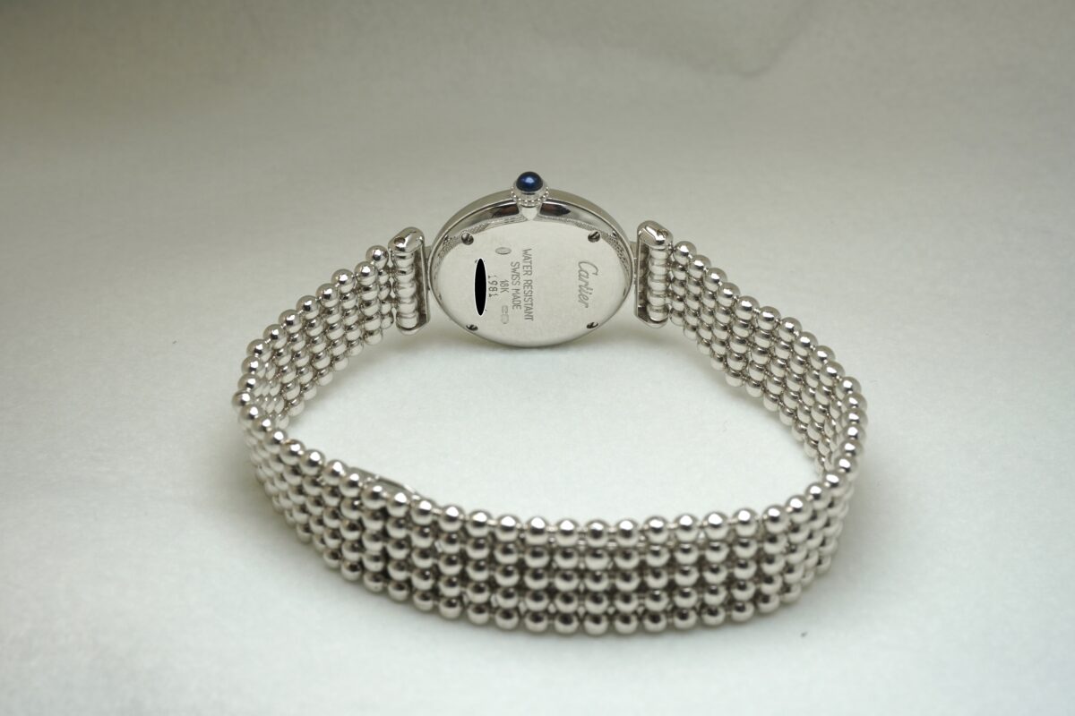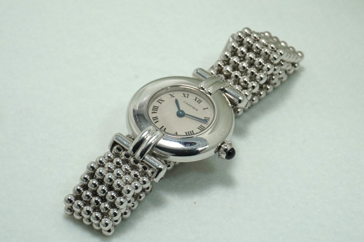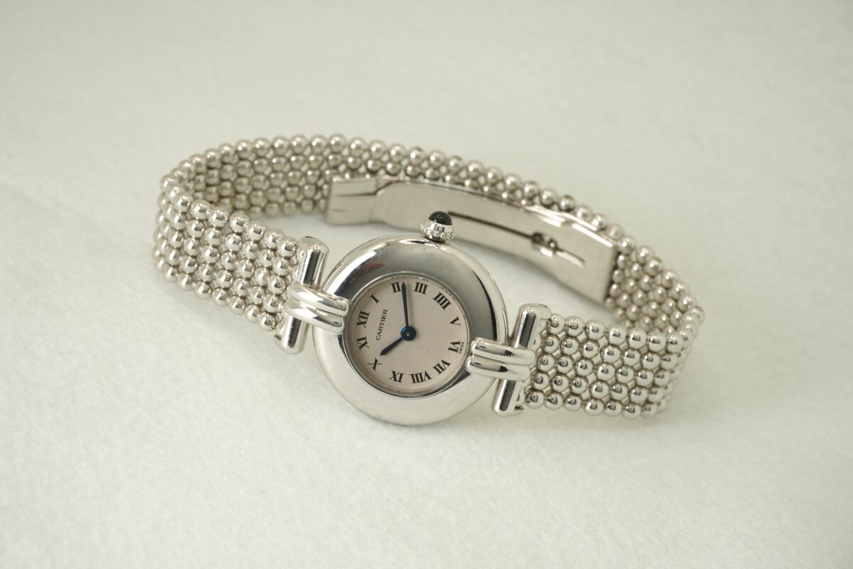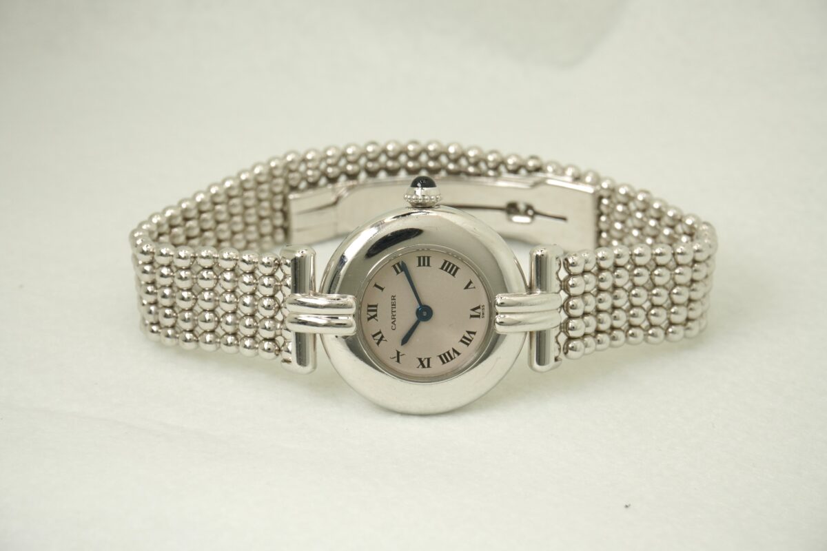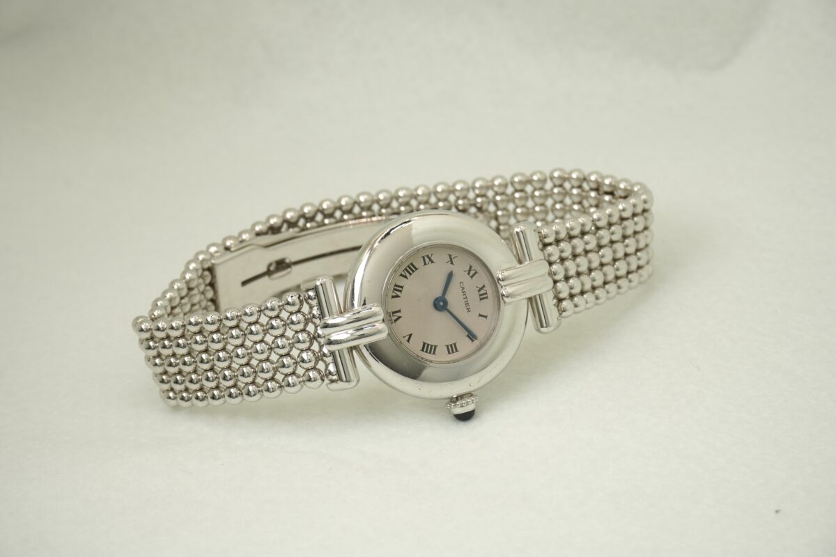 マストコリゼ(ヴェルメイユ20μ・イエローゴールド)は比較的見る事が出来ますが、こちらの時計のコリゼは、オリジナルブレスと同様のホワイトゴールド素材のブレスレット付きであまり見られない珍しい時計です。YGタイプの同じデザインは少ないながらも確認できますが、WG自体の流通も少なく、こちらと同じモデルは海外を見渡しても中々見付ける事が出来ません。特に日本国内では被る確率はかなり低いレアな時計ですのでオンリーワンウオッチと言えます。個体の特徴と言えば、太めのベゼルにかけて一体となったケースから覗かせるマット調の円型ダイアルは、カルティエの代名詞とも言えるローマンインデックス、艶の良い青焼き針がカルティエの上品なイメージと柔らかい丸みが可愛らしい印象を受けます。ブレスは2ミリの円球を横に均等に5連に並べたボールチェーン仕様で、自由自在に動かせられるタイプで適度な間隔の隙間があり、ジュエリーの様に重宝出来るお洒落なブレスです。18KWGのDバックルは留め具がブレスの中に入りこんで、表からは継ぎ目がわからなくなるほど一体化していて、デザイン的にも優れたブレスで長さは約16.5㎝くらいです。こちらの時計が気になる方はお問い合わせ下さいませ。