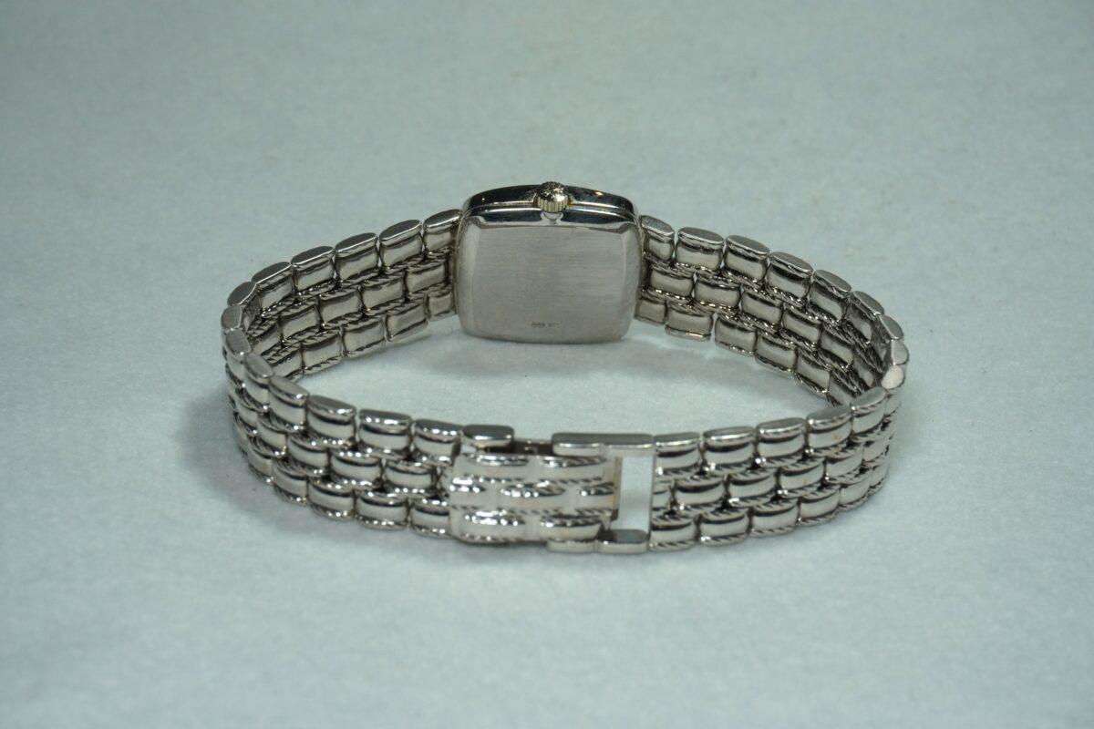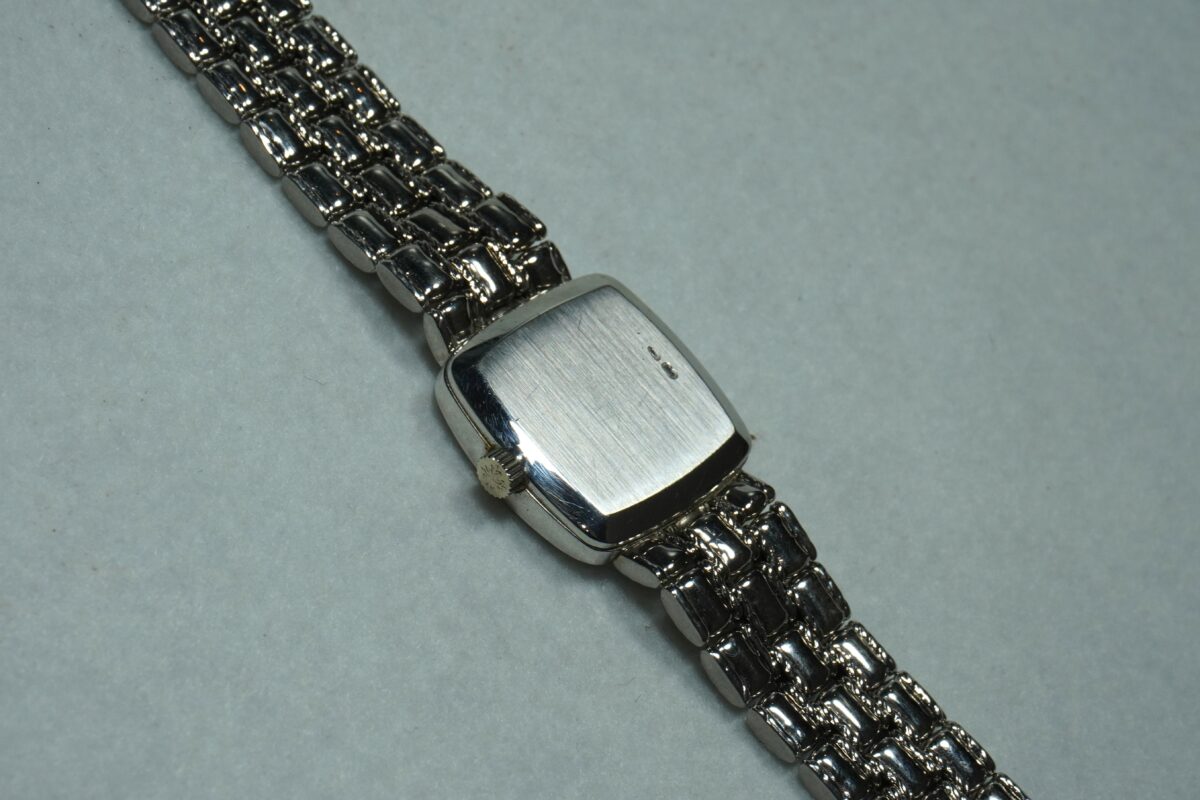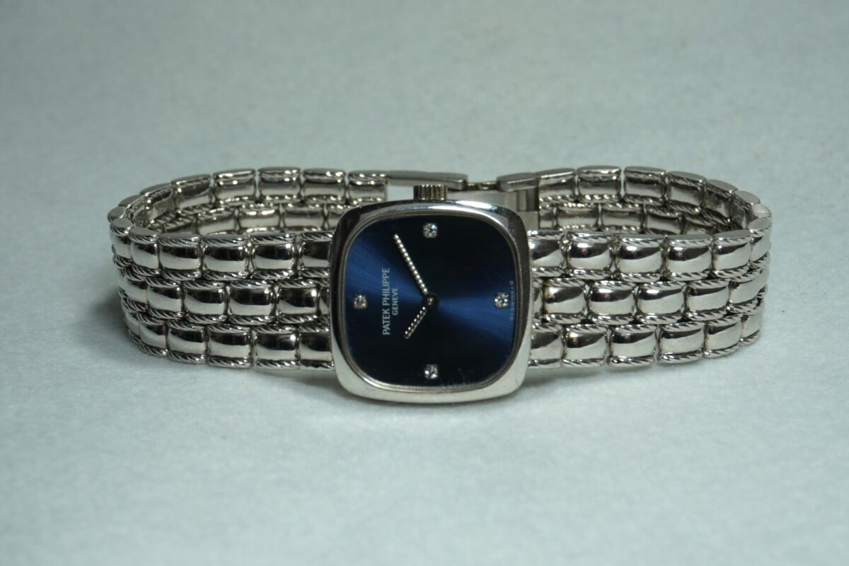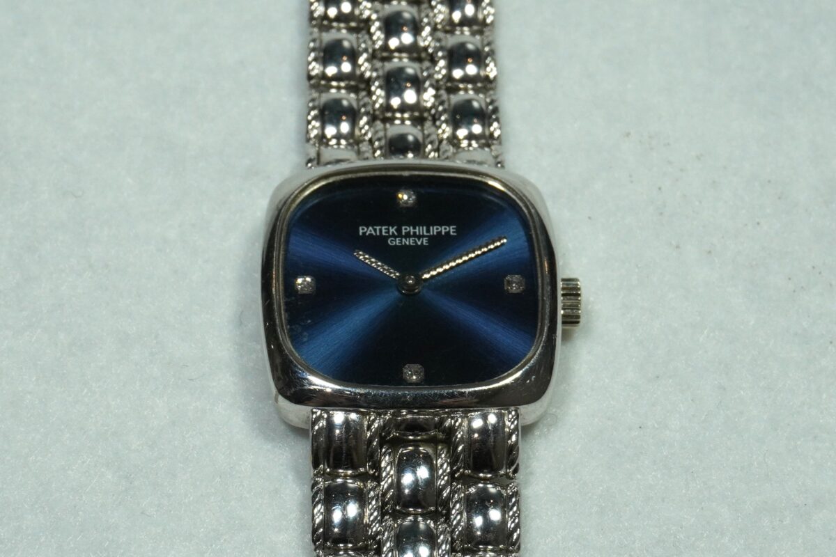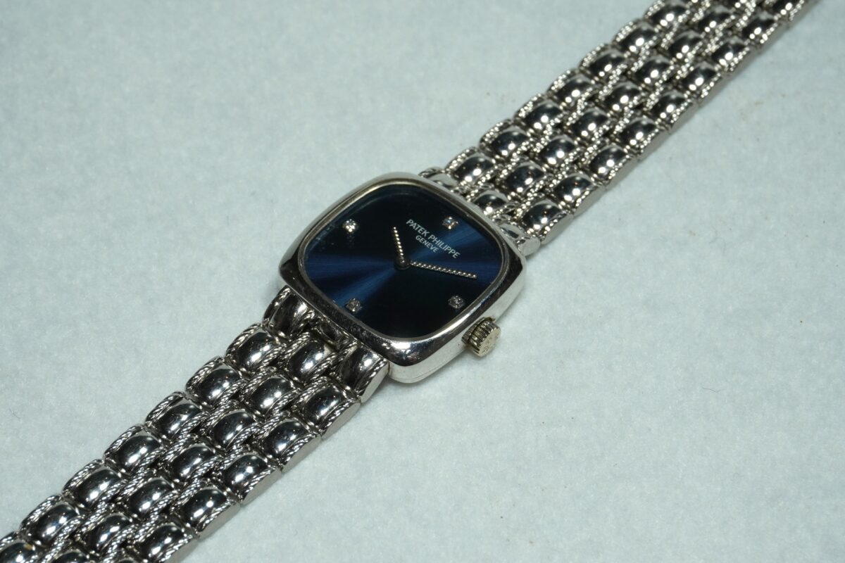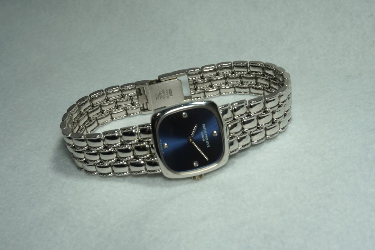 レディース、パテックフィリップのスクエアタイプ・18KWG製ブレス一体型のご紹介です。