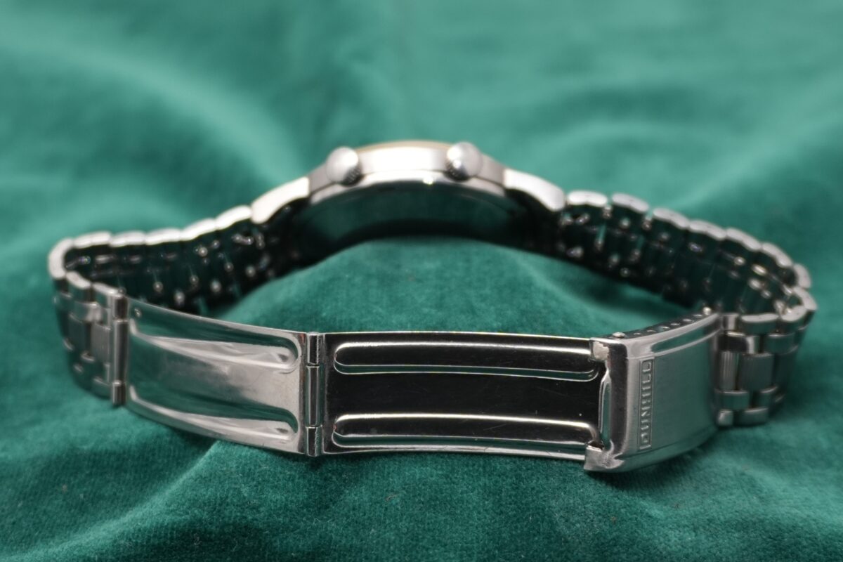 ステンレススティールケースは小傷や裏蓋のオープナー痕こそございますが、打痕はなくオリジナルのシェイプを維持。さらに、希少なゲイ・フレアー製「dunhill」純正ブレスレットを装備しており、年代相応の伸びはあるものの、大きなダメージやがたつきはございません。