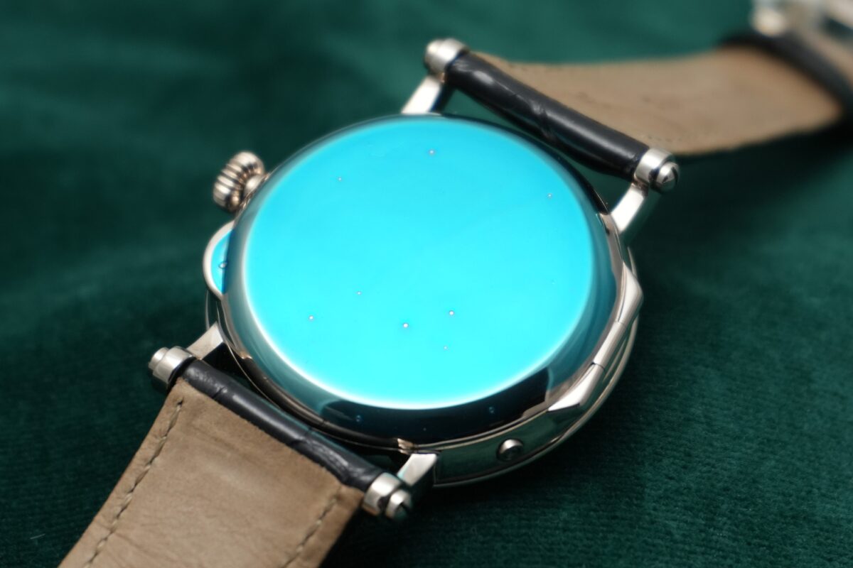 ケースはドーム型のベゼルで玉ねぎ型のリューズが付き、ラグはビス留め式の構造でバックケースはヒンジ付きのオフィサーズケースバックになっており、開閉することによって美しいムーブメントを視認出来ます。