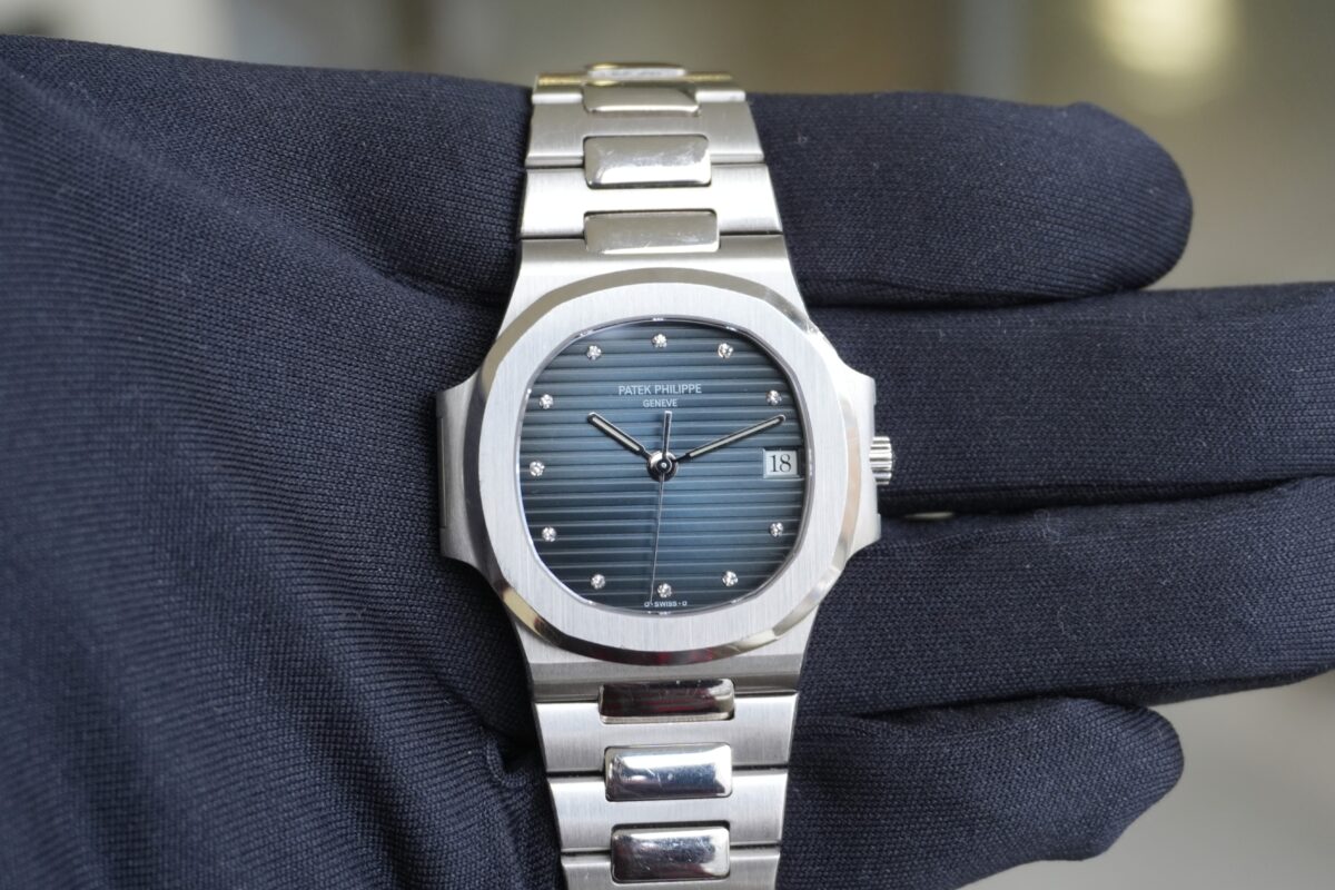 本品は希少なプラチナ製のRef.3800/1で、ダイアルはダメージのない良好なコンディションでパテックブルーの文字盤に10ポイントのダイヤモンドがセッティングされ、上品な輝きを放っています。