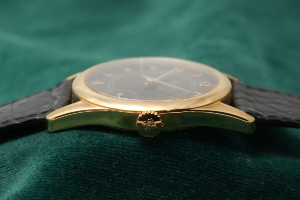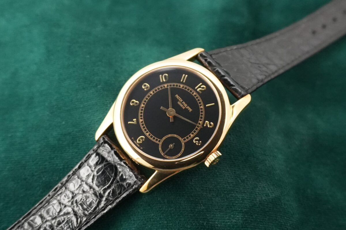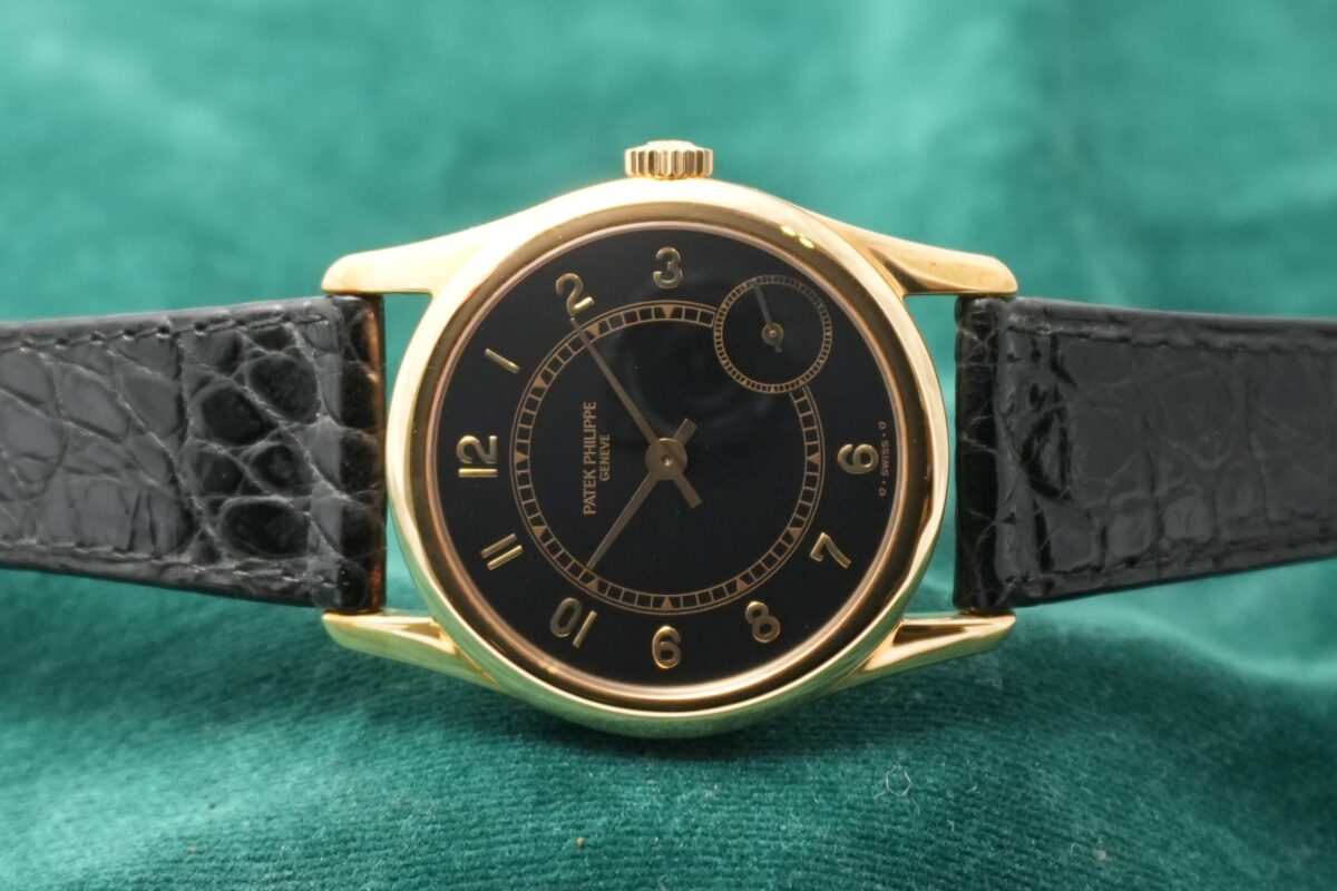 クラシックなカラトラバの系譜にありながら、4時位置に配されたスモールセコンドやブラックダイヤルなど、1990年代パテックを象徴する個性を備えた一本です。