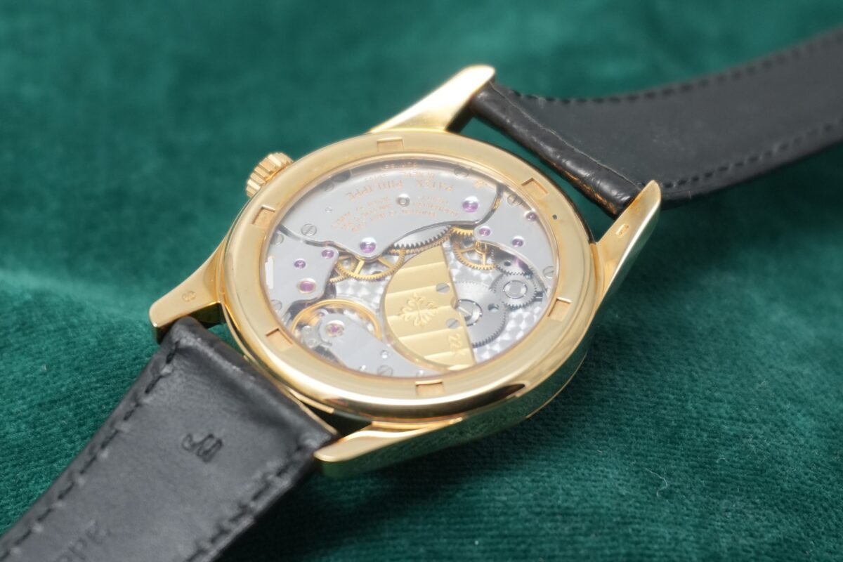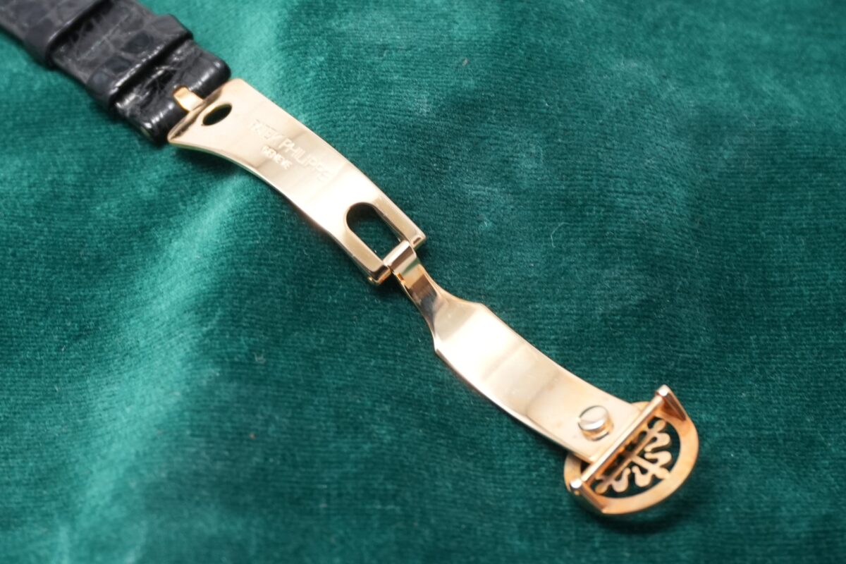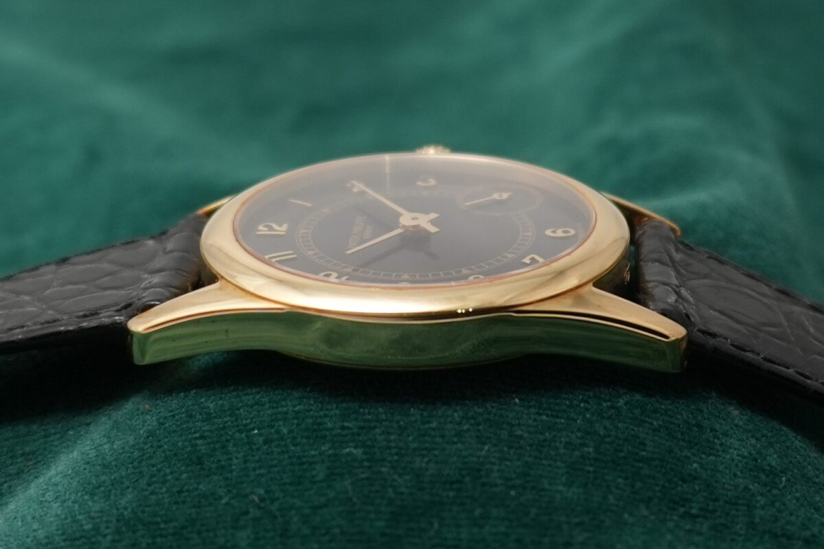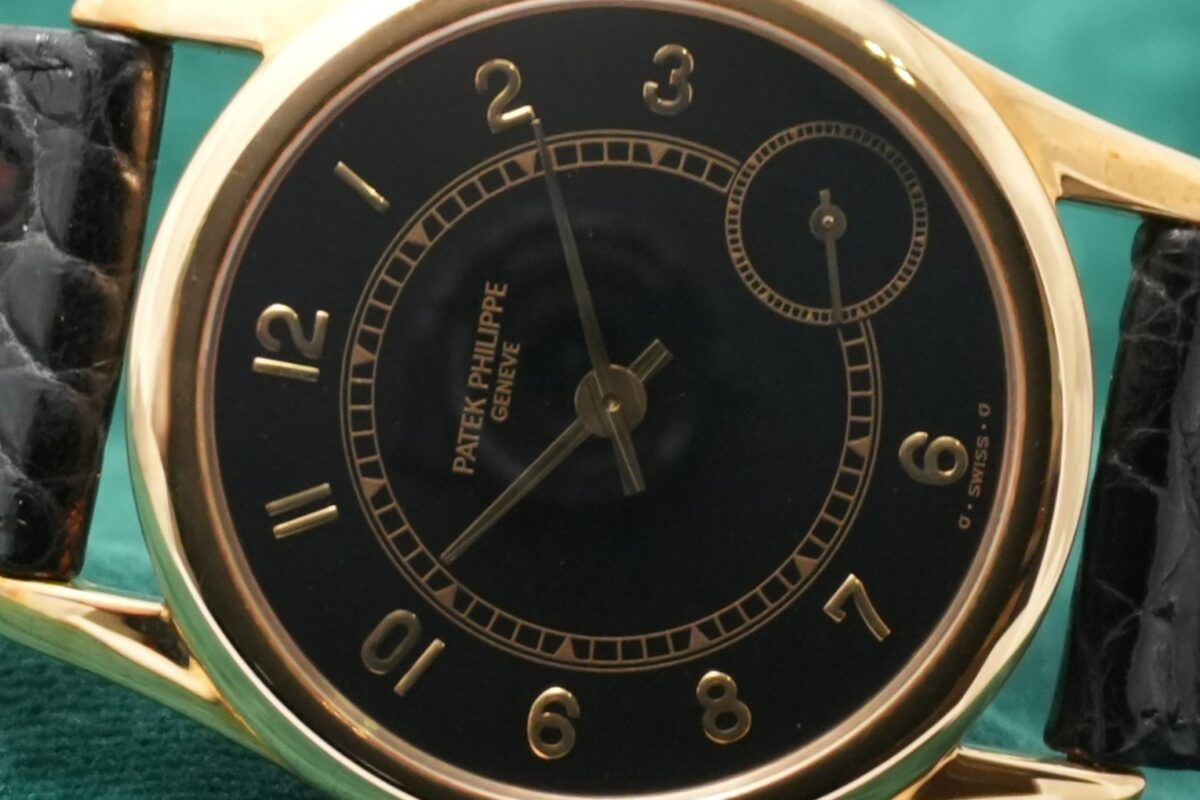 クラシックなカラトラバの系譜にありながら、4時位置に配されたスモールセコンドやブラックダイヤルなど、1990年代パテックを象徴する個性を備えた一本です。