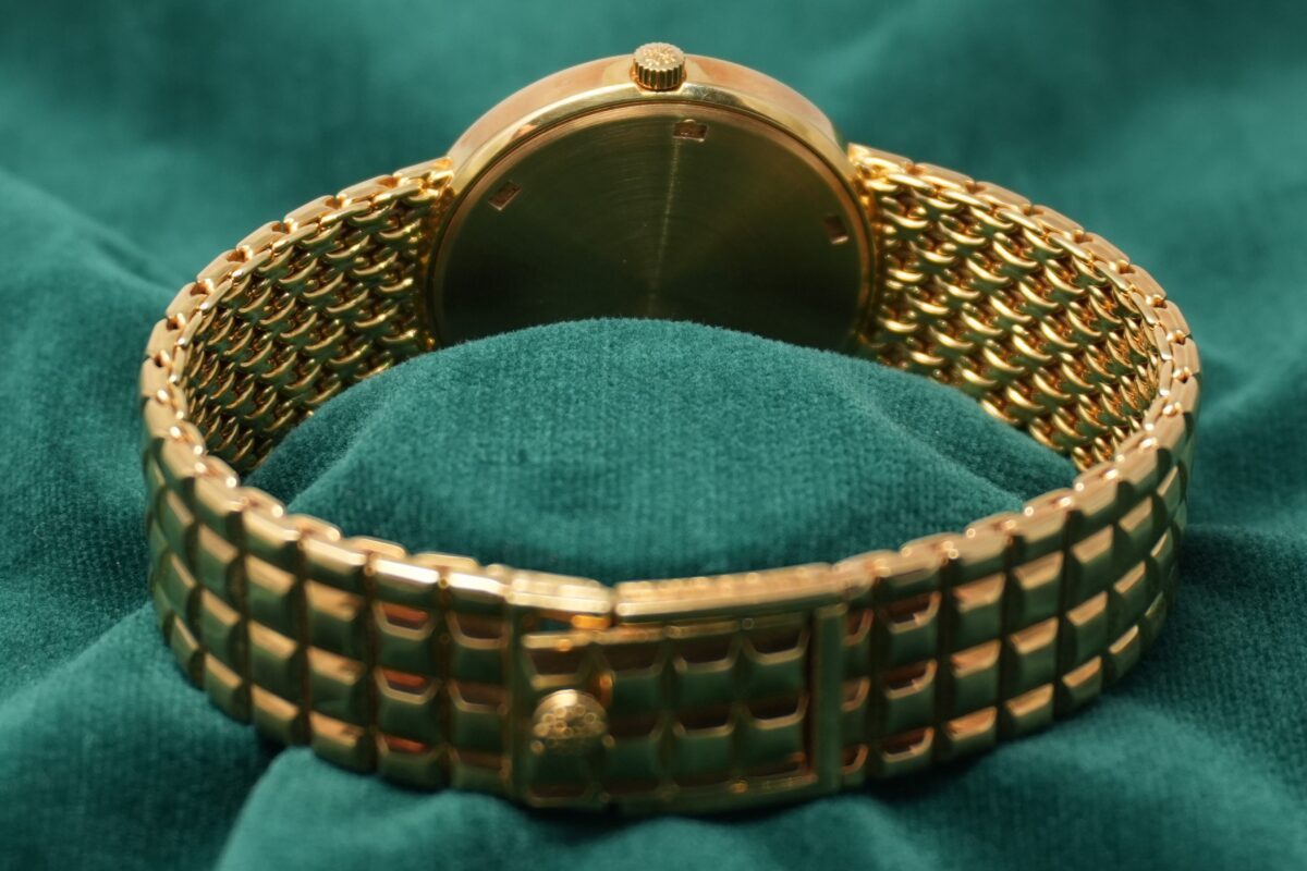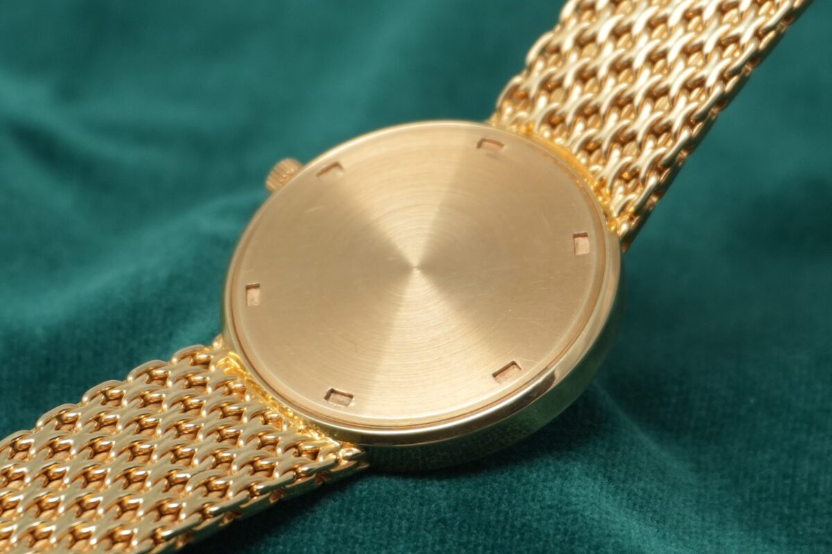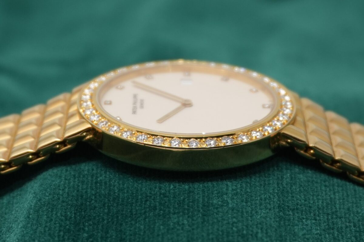 18KYG のブレスレット一体型ケースのベゼルにはダイヤモンドがセッティングされており、凝った意匠のブレスレットはしなやかで素晴らしい着用感です。