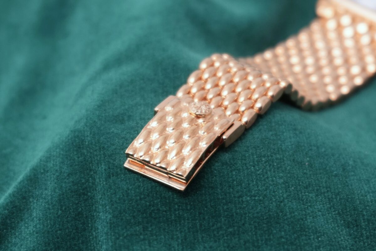 薄型ケースと一体型の18K YG ブレスレットは、美しい仕上げとしなやかな構造で非常に良い着用感です。全体に若干の擦れや小傷はありますが、ダメージや磨きでエッジが潰れがちな個体が多い中、本品はエッジの立った抜群のコンディションを保っています。