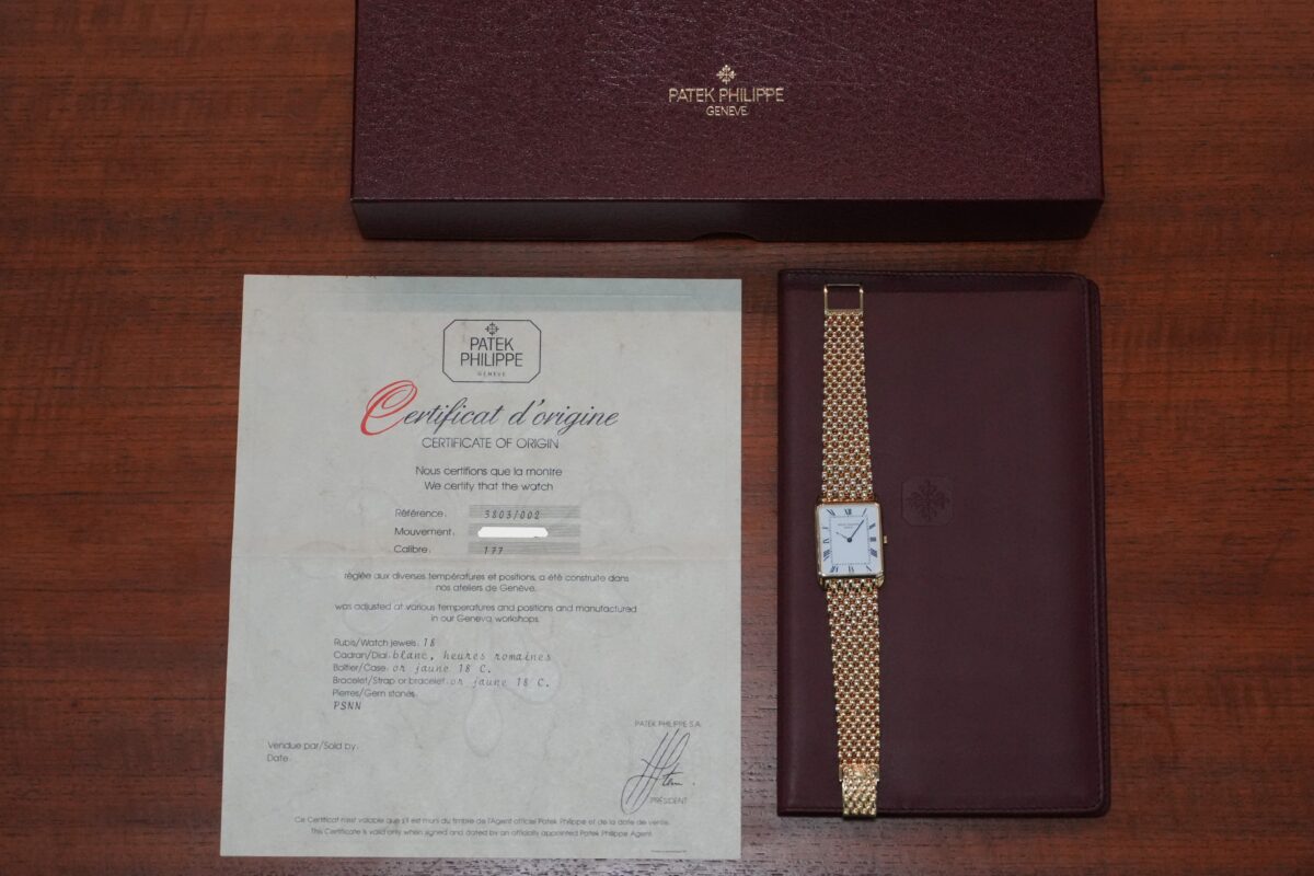 パテック フィリップ ゴンドーロ 3803/2、ブレスレット一体型モデルが良いコンディションで、BOX・ギャランティー付きで入荷しました。